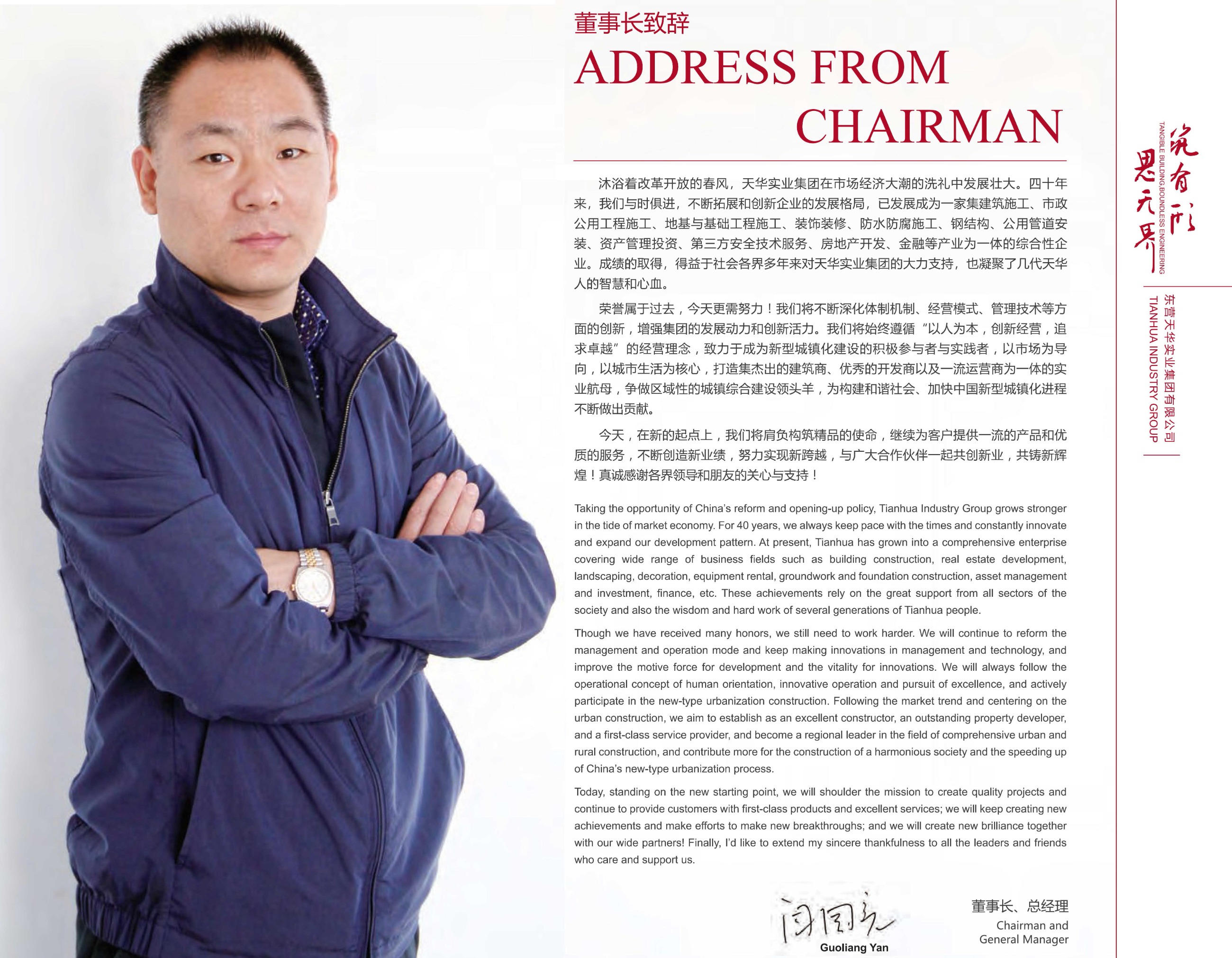 沐浴著改革開放的春風(fēng),天華實業(yè)集團在市場經(jīng)濟大潮的洗禮中發(fā)展壯大。四十年來,我們與時俱進,不斷拓展和創(chuàng)新企業(yè)的發(fā)展格局,已發(fā)展成為一家集建筑施工、市政公用工程施工、地基與基礎(chǔ)工程施工、裝飾裝修、防水防腐施工、鋼結(jié)構(gòu)、公用管道安裝、資產(chǎn)管理投資、第三方安全技術(shù)服務(wù)、房地產(chǎn)開發(fā)、金融等產(chǎn)業(yè)為一體的綜合性企業(yè)。成績的取得,得益于社會各界多年來對天華實業(yè)集團的大力支持,也凝聚了幾代天華人的智慧和心血。榮譽屬于過去,今天更需努力!我們將不斷深化體制機制、經(jīng)營模式、管理技術(shù)等方面的創(chuàng)新,增強集團的發(fā)展動力和創(chuàng)新活力。我們將始終遵循“以人為本,創(chuàng)新經(jīng)營,追求超越”的經(jīng)營理念,致力于成為新型城鎮(zhèn)化建設(shè)的積極參與者與實踐者,以市場為導(dǎo)向,以城市生活為核心,打造集杰出的建筑商、良好的開發(fā)商以及優(yōu)良運營商為一體的實業(yè)航母,爭做區(qū)域性的城鎮(zhèn)綜合建設(shè)領(lǐng)頭羊,為構(gòu)建和諧社會、加快中國新型城鎮(zhèn)化進程不斷做出貢獻。